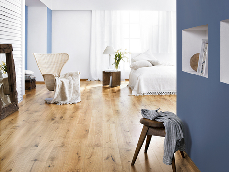Étant donné que la chambre ne va pas autant que dans d'autres pièces, il n'y a pratiquement pas d'invités ici, pour plancher peut utiliser des matériaux avec pas la plus haute résistance à l'usure, mais placez d'abord l'apparence du revêtement. De plus, il est important de considérer que la chambre est souvent marchée pieds nus, donc la surface chaude du sol est un atout évident.