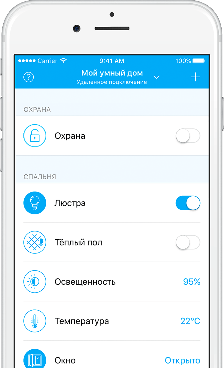 Ces éléments, installés et connectés en un seul système, ouvrent des possibilités illimitées. En utilisant l'application, vous pouvez, par exemple, éteindre le fer à repasser, allumer le chauffage avant d'arriver à la maison, ou lorsque la température descend en dessous d'un point de consigne, couper l'alimentation toutes les prises pour la sécurité de l'enfant en cas d'absence d'adultes à domicile. Vous pouvez allumer certains appareils d'éclairage pour créer l'apparence de quelqu'un à la maison, configurer le système de sorte que la lumière dans la pièce s'allume dès que quelqu'un y pénètre. Il existe de nombreuses options - le système peut être adapté à tous les besoins.