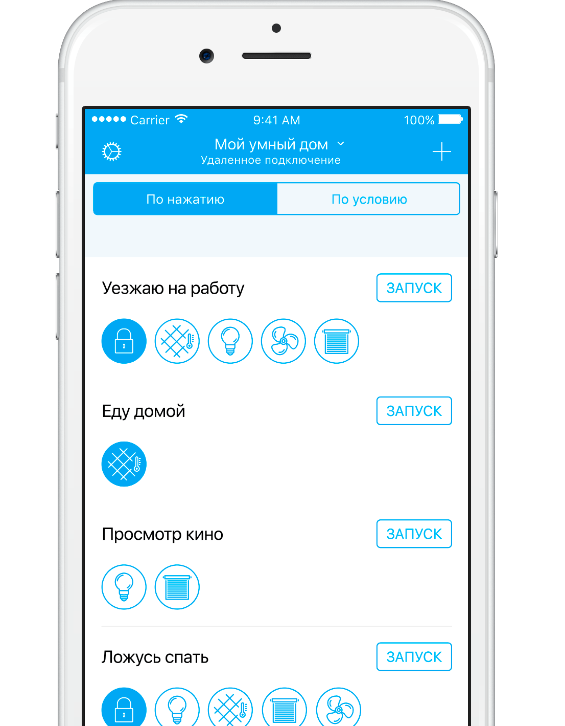 - création et gestion de scripts. Au lieu de courir dans l'appartement avant de quitter la maison et d'éteindre les lumières, les appareils électriques, le chauffage et les volets partout, vous pouvez simplement créer scénario appropriééteindre les appareils et les systèmes nécessaires et mettre l'appartement en garde. L'utilisateur n'a besoin que d'appuyer sur un bouton, ce qui fait gagner du temps et garantit que vous n'oublierez certainement rien. De plus, les scripts peuvent ne pas être activés en appuyant sur le boutonet automatiquement: il est nécessaire de régler l'action et une certaine condition, et 15 minutes avant le réveil, par exemple, le système de sols chauds sera activé.