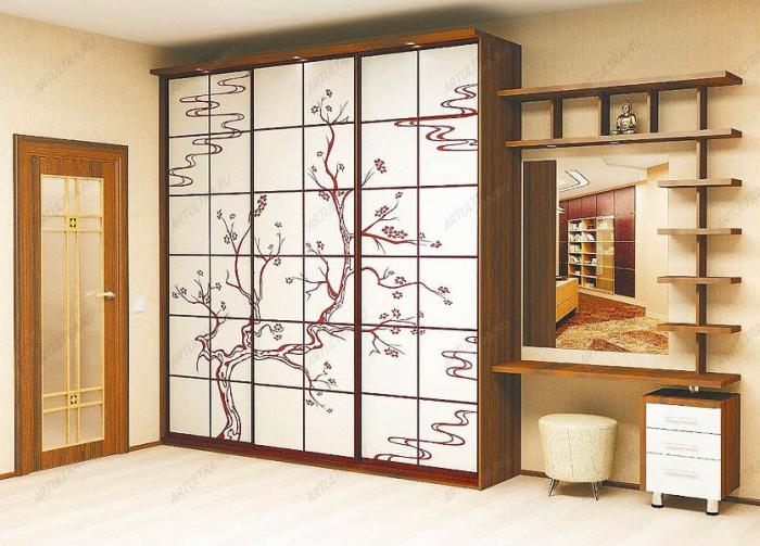 Portes coulissantes à l'extérieur, ils peuvent être décorés comme vous le souhaitez. Même lorsqu'il semble impossible de surprendre les clients, les concepteurs proposent de plus en plus d'options de conception de portes. L'option la plus simple est planches de bois lamellé, plaqué ou peint. Ils peuvent reproduire la structure du bois naturel, de la pierre, être peints dans n'importe quelle nuance, avoir une surface mate ou brillante, il n'est donc pas difficile d'entrer dans une armoire à l'intérieur de tout type.