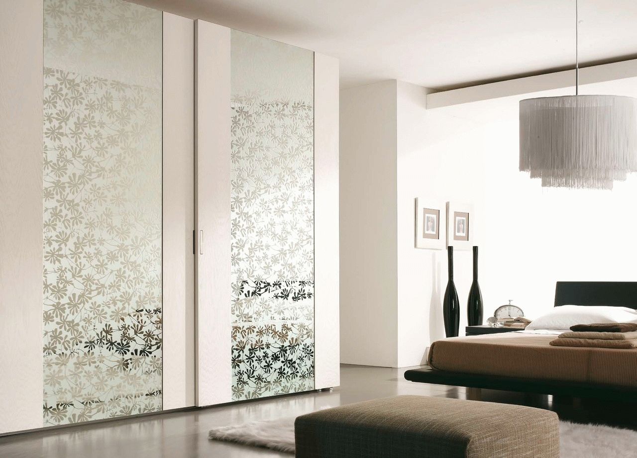 Une excellente alternative à une surface miroir - verre dépoli. Il réfléchira la lumière de la même manière, contribuant à l'expansion visuelle de l'espace, il sera intéressant et élégant à regarder. Peut utiliser des portes avec différents motifs et motifsest également populaire impression photogrâce à laquelle vous pouvez créer un design exclusif d'une garde-robe.