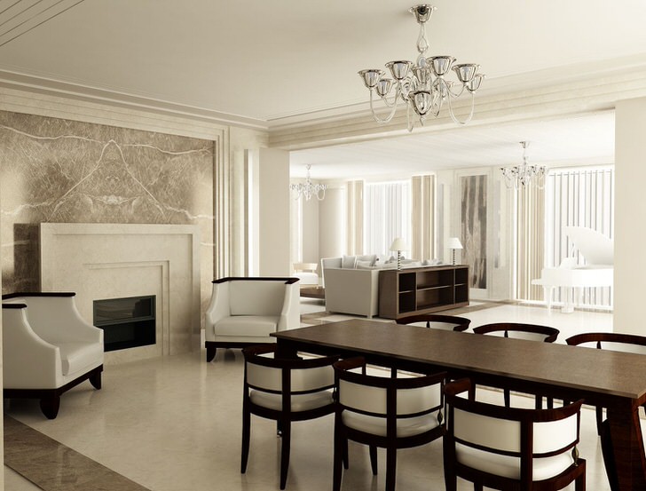 - pour la décoration des matériaux naturels sont utilisés. Les sols sont en bois coûteux, parquet d'art, dans la salle de bain - marbre, pour décoration murale, vous pouvez choisir la soie ou le brocartdans les cas extrêmes - papier peint texturéimitant des tissus coûteux. Les murs sont décorés de bas-reliefs, de pilastres, fresque. Le plafond est peint en ivoire ou blanc, décoré de stuc;