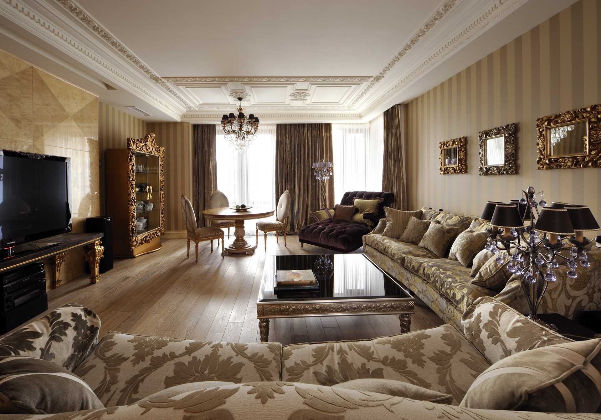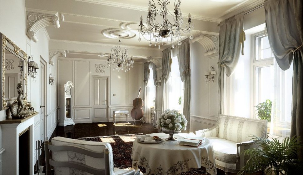 - sol en marbre ou bois naturel, pour les murs, ils utilisent des garnitures en tissu, des papiers peints aux couleurs baroques, des peintures murales ou des tapis. Si les murs sont simples et peint aux couleurs pastel, elles doivent être décorées moulure en stuc. Décoration obligatoire du plafond - moulure en stuc, motifs ornésla présence de dorure;