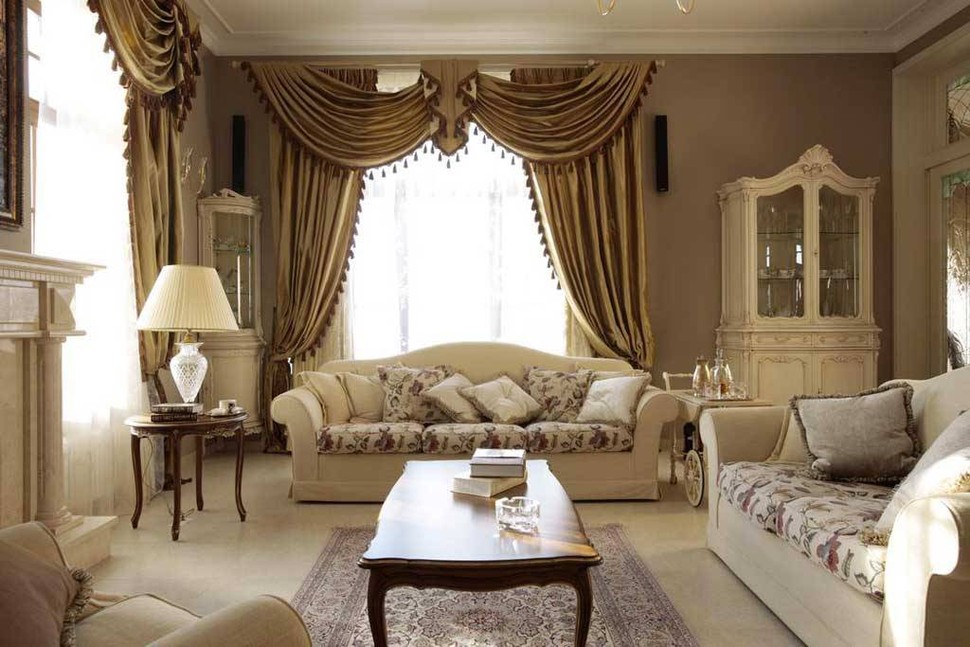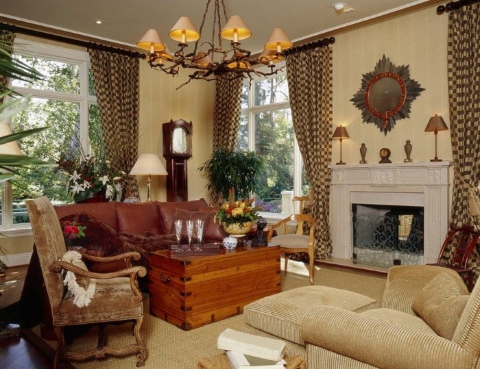 - utiliser un pour l'éclairage grand lustre, lampes modernes ou rétro, les fenêtres sont décorées de rideaux massifs;