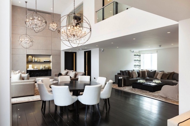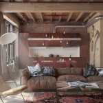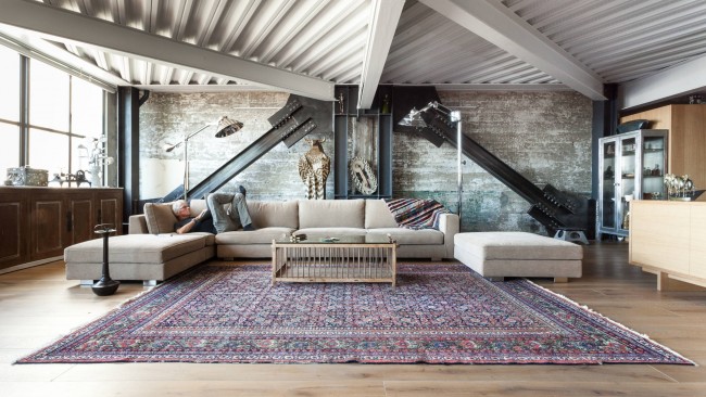 - intérieur de style loft Est-ce immenses surfaces, hauts plafonds et grandes fenêtres, beaucoup de lumière, surfaces «brutes», visibilité des sols et tuyaux de ventilation, manque de murs (seule la salle de bain est isolée);