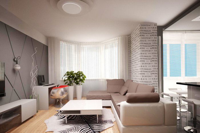 - c'est style universelqui convient pour des espaces de tout type et de toute taille. Le démantèlement des cloisons et combinaison de cuisine et salon. Une disposition géométrique stricte est la bienvenue;