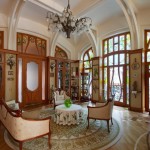 - L'éclairage Art Nouveau est faible afin que vous puissiez créer une atmosphère romantique. Particularité - luminaires en verre coloré ou dépoli, vitrail dans la conception des fenêtres et des portes;