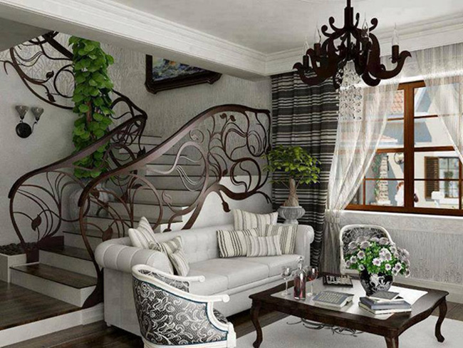 - L'Art nouveau suggère l'utilisation de lignes douces, cela s'applique aux meubles, aux portes, fenêtres et la méthode d'arrangement des meubles - pas de formes strictes et régulières;