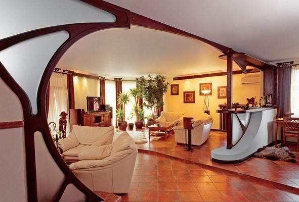 - arbre en haute estime dans le style Art Nouveau, donc les sols sont mieux faits de bois, dans la cuisine, il peut être remplacé par de la pierre ou carrelé. Murs et plafond tache ou plâtreen utilisant des teintes pastel. Le moderne ne tolère pas les matériaux bon marché;