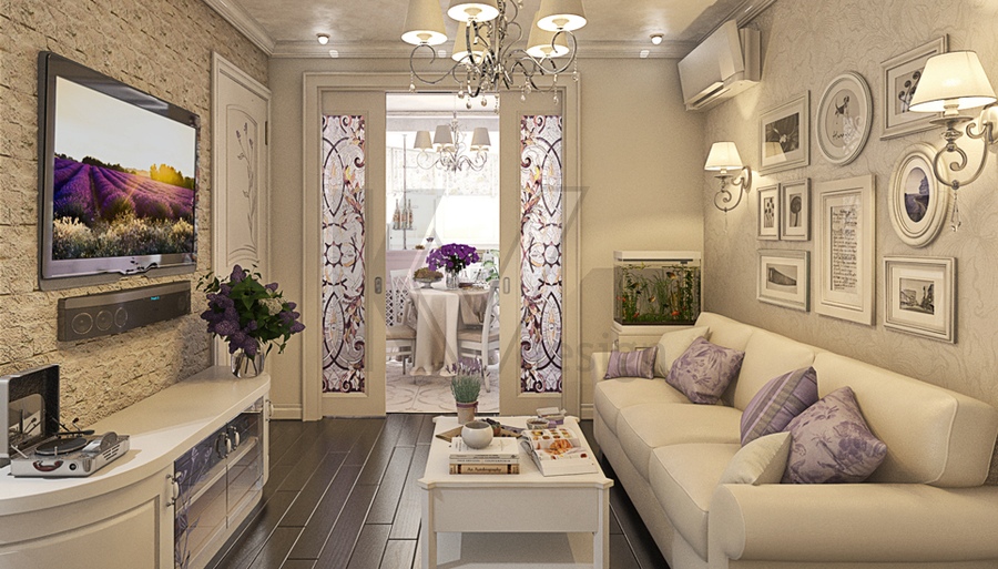 - la décoration murale est en cours textile ou papier peint en vinyle, plâtre décoratifpour une utilisation au sol parquetVous pouvez combiner différents types de bois. Le plafond est rendu aussi simple que possible, mais l'utilisation d'un médaillon ou d'une moulure en stuc retenu le long du contour n'est pas exclue;