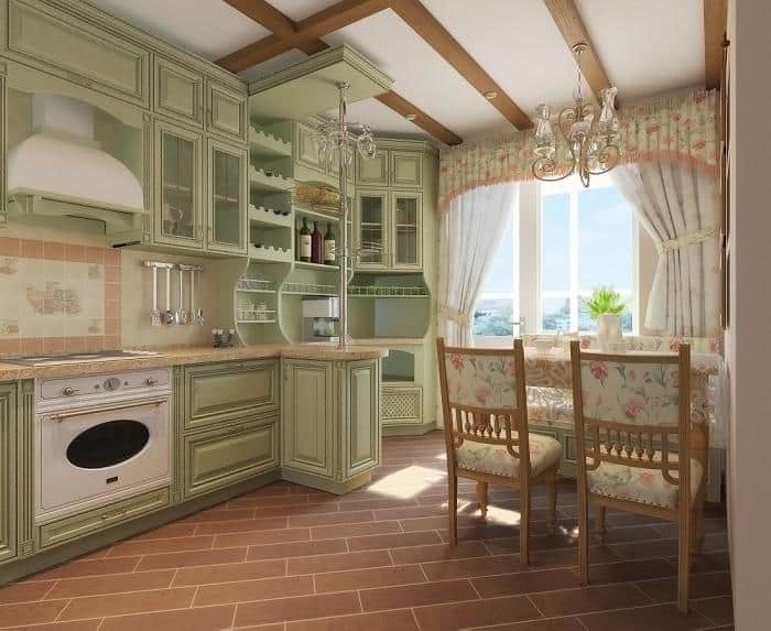 - style de gamme de couleurs - tout teintes douces naturelles. Il est beige, marron, bleu, vert, blanc. Les meubles doivent être plus foncés que les matériaux de finition;