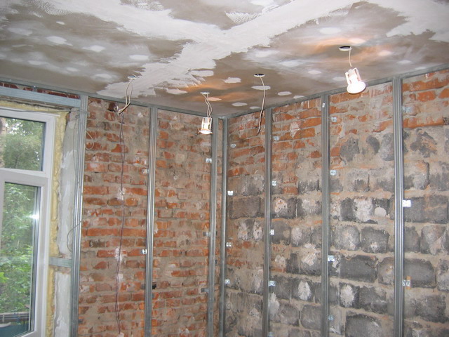 En ce qui concerne les irrégularités les plus importantes et les différences de niveau de mur importantes, la meilleure façon de niveler la surface consiste à utiliser des cloisons sèches et à les monter de façon cadre. Dans ce cas, c'est le plus moyen simple, bon marché et rapide pour obtenir une surface murale parfaitement lisse et lisse. De plus, vous n'avez pas besoin de dépenser beaucoup de temps et d'efforts pour préparer la surface du mur - elle avec toutes ses fissures, nids de poule et gouttes sera cachée derrière le cadre et la cloison sèche. De plus, à l'intérieur du cadre, vous pouvez établir des communications ou organiser des chaud et insonorisation.