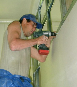 remplir le cadre de communications, un matériau isolant thermique ou acoustique, si nécessaire;- installation de plaques de plâtre. Feuilles appropriées d'une épaisseur de 12,5 mm. L'installation commence à partir de n'importe quel coin supérieur, les feuilles sont fixées avec des vis, l'étape de fixation est de 30 cm, les chapeaux sont en retrait de 1 mm afin que vous puissiez finalement obtenir une surface lisse;