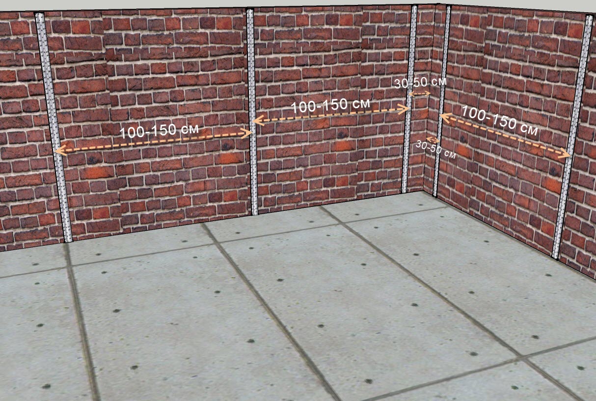 Les lignes de guidage sont fixées le long des lignes reçues avec des vis autotaraudeuses, vérifiant constamment la régularité de leur niveau avec un fil à plomb. Entre eux, perpendiculairement à eux, des profils de support sont fixés le long du mur avec vis. La distance entre eux est de 40 à 60 cm pour les plaques de plâtre de 120 cm de large;