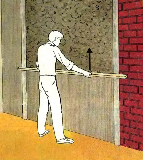 plâtrage. Pour ce faire, vous pouvez utiliser le "faucon" et la truelle. Le premier est rempli d'un mélange du réservoir, le second est projeté sur le mur en excès. L'utilisation du «faucon», un outil similaire aux truelles, mais de taille supérieure, vous permet d'augmenter la vitesse de travail. Vous avez maintenant besoin de la règle pour répartir uniformément la solution de bas en haut, en vous appuyant sur les balises. Si la couche de nivellement est épaisse, vous pouvez d'abord appliquer un contour rugueux du plâtre, et après l'avoir séché, appliquer le principal avec alignement le long des balises. Si des lattes de bois étaient utilisées comme ce dernier, alors quand le mortier sèche un peu, elles doivent être soigneusement enlevées, les cavités remplies de plâtre et nivelées avec une spatule;