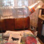 - les bouteilles à fond coupé sont portées sur une fine latte de bois, tandis que le col d'une bouteille s'insère étroitement dans une autre bouteille;