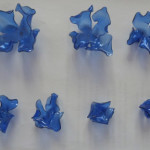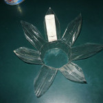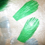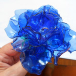 Au lieu de cols, vous pouvez utiliser la majeure partie de la bouteille. Au départ, vous devez préparer des modèles, encercler leur contour sur la bouteille et les couper. Maintenant, à l'aide d'une bougie et d'une pince à épiler, vous pouvez donner à la fleur n'importe quelle forme. La fleur est assemblée à partir de plusieurs de ces flans qui sont collés ou cousus ensemble. Ainsi, il est possible de faire roses, oeillets, marguerites et d'autres fleurs. Les corolles des sépales sont fabriquées à partir d'une bouteille verte utilisant la même technologie: création d'un pochoir, découpe de pièces en plastique, refusion.