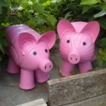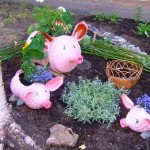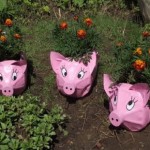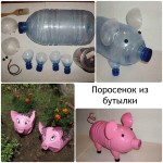 - Porcelets en bouteille - La façon la plus simple de décorer le site. La base sera une bouteille de 5 litres. Les oreilles devront être coupées dans des bouteilles de 2 litres et les cols de petites bouteilles en plastique serviront de jambes. Lorsque toutes les pièces sont prêtes, elles sont collées avec un pistolet à colle et "l'animal" fini est peint avec de la peinture rose. Après séchage, vous pouvez dessiner ou coller les yeux sur les boutons, peindre les contours des oreilles et le nickel avec de la peinture, faire la queue du fil. Si vous percez un trou à l'arrière du porcelet à l'avance, la figurine peut être utilisée comme pot de fleurs;