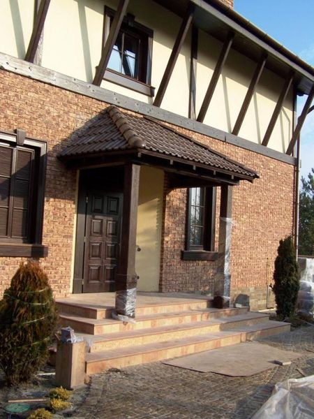 - la visière doit correspondre au style de la maison, son groupe d'entrée et l'intriguePar conséquent, lors de son agencement, il est nécessaire de choisir des matériaux, des couleurs et des formes appropriés. Vous pouvez appliquer dans sa conception le même matériau que pour toits de maisonsou utilisez les mêmes éléments que dans escrime.