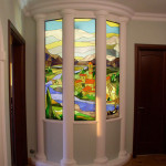 Des panneaux en verre teinté peuvent être utilisés pour décorer les murs.Si en même temps organiser l'éclairage, un tel vitrail peut servir de veilleuse intéressante, jouer le rôle d'éclairage décoratif ou devenir un détail d'accent à l'intérieur de n'importe quelle pièce. Si vous considérez qu'avec l'aide de différentes techniques, vous pouvez appliquer presque n'importe quel motif, nous obtenons la plus grande latitude pour l'imagination du design. De même, vous pouvez créer fausses fenêtres, et c'est une solution indispensable pour les pièces dans lesquelles la lumière naturelle ne pénètre pas.