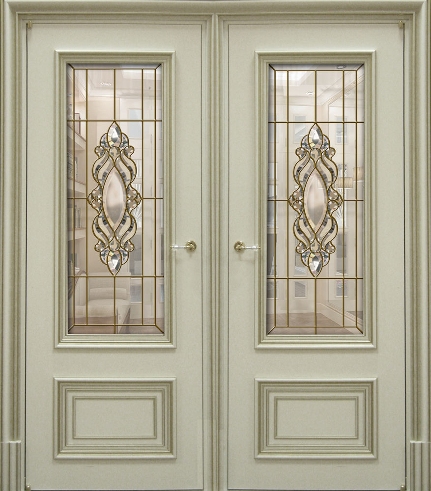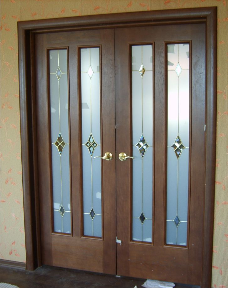 Le vitrail peut occuper la partie principale porte intérieureet servir seulement comme un petit insert. Les portes en verre teinté décoreront l'intérieur dans un style classique. Si l'insert du vitrail est grand et suffisamment transparent, la lumière peut pénétrer dans les pièces voisines, sans violer l'isolation. Souvent, des motifs abstraits sont utilisés pour décorer les portes dans une palette de couleurs vives.