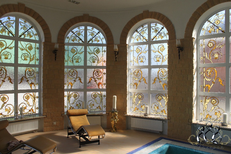 Le vitrail est une excellente imitation de techniques classiques complexes. La méthode consiste à appliquer à la base d'un circuit polymère spécial, qui est similaire à une broche, après quoi les zones résultantes sont remplies de peintures à base de solvant. Des vitraux similaires peuvent être réalisés manière manuelle ou partiellement automatisée. Idéal pour décorer les armoires, les écrans, les niches, les plafonds et plus encore.