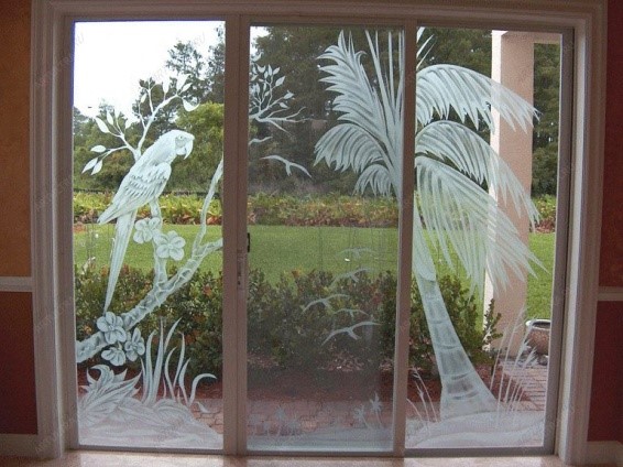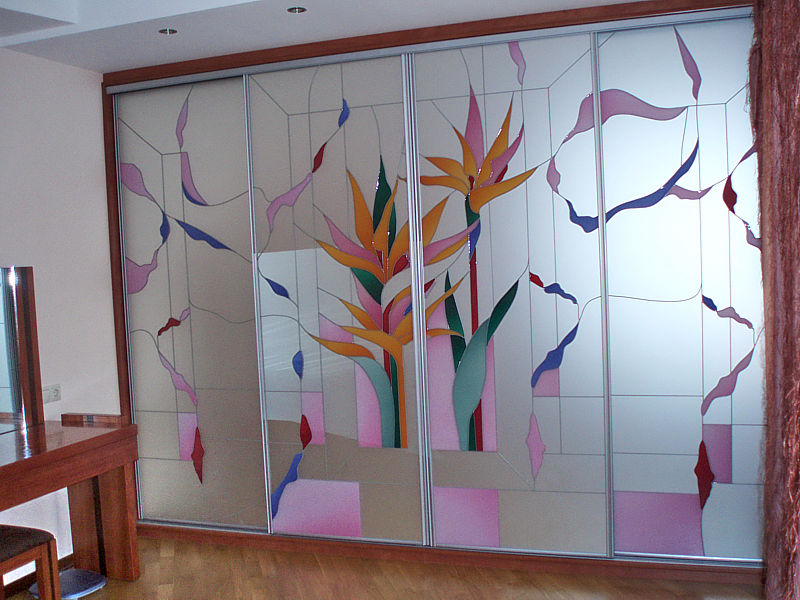 En outre, lors du traitement, vous pouvez utiliser des pigments colorants pour obtenir une image en couleur. Le plus difficile est de réaliser un vitrail sablé double face, car l'image doit parfaitement correspondre des deux côtés. Vitrail sablé excellent adapté à la décoration d'armoires, de portes, écranmiroirs.