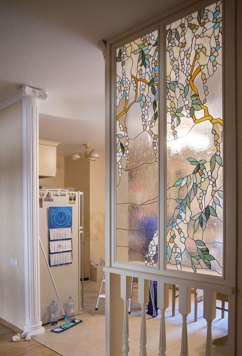 Le zonage de l'espace est souvent effectué à l'aide de cloisons sèches ou écran. S'ils sont décorés d'un vitrail, alors nous obtenons une décoration élégante de la pièce. La technique du vitrail est choisie en fonction du style de l'intérieur, mais l'utilisation d'éléments trop transparents n'est pas recommandée.