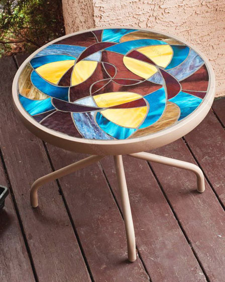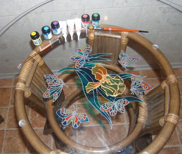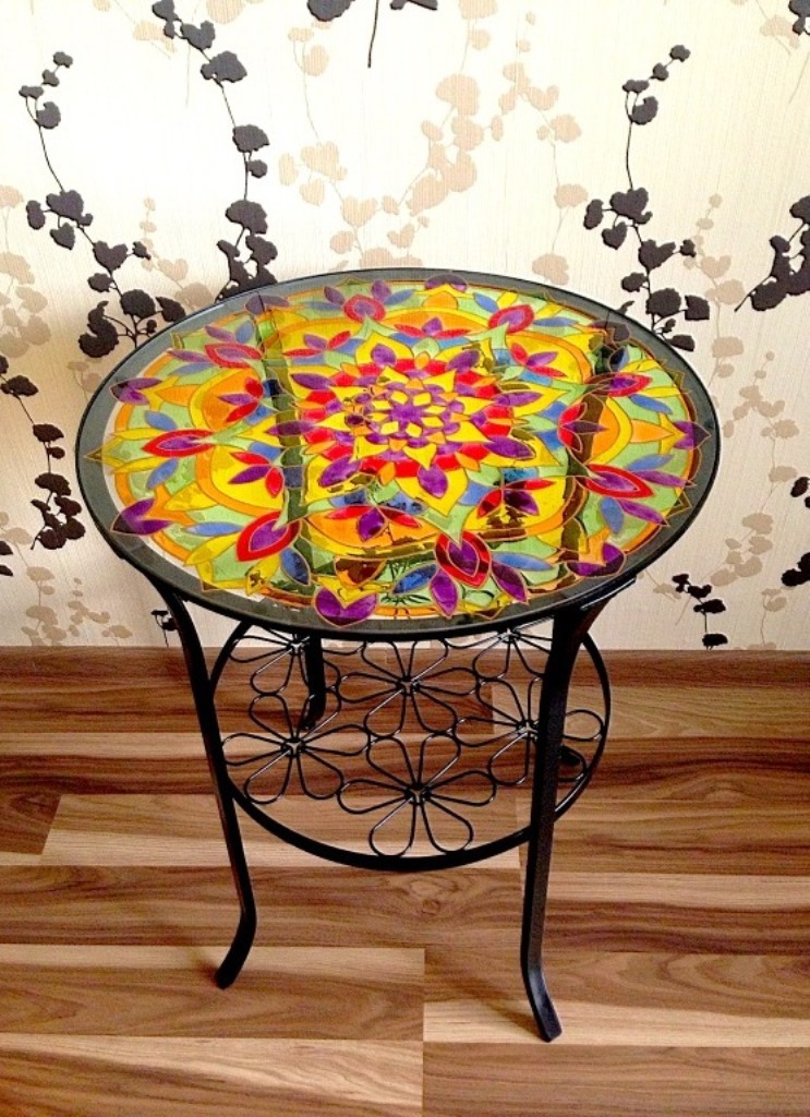Le vitrail aidera à transformer même les plus ordinaires journal ou table à manger. Si vous décorez le comptoir avec un vitrail sablé, nous obtenons une décoration intérieure élégante qui ne perdra pas sa fonctionnalité: vous pouvez écrire en toute sécurité sur la table, mettre une tasse avec du thé chaud, etc.