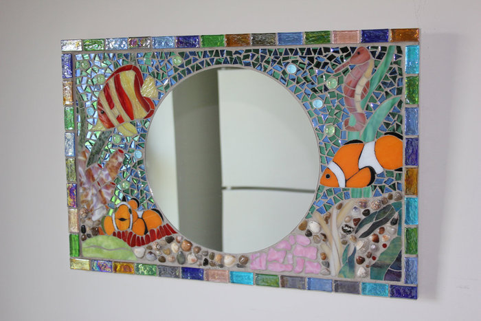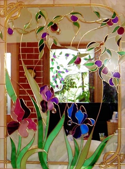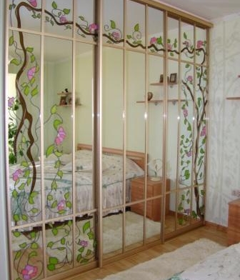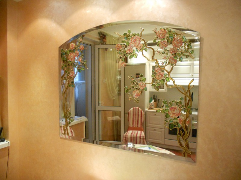 Le vitrail peut être couvert surface miroir, en tout et en partie. Dans le premier cas, nous obtenons une décoration intéressante pour l'intérieur, ainsi que la possibilité d'agrandir visuellement l'espace. Le miroir peut être utilisé conformément à sa destination, si seulement ses bords sont ornés d'un vitrail. Habituellement, le vitrail sablé est utilisé pour la décoration, le film ou le vitrail peint convient également.