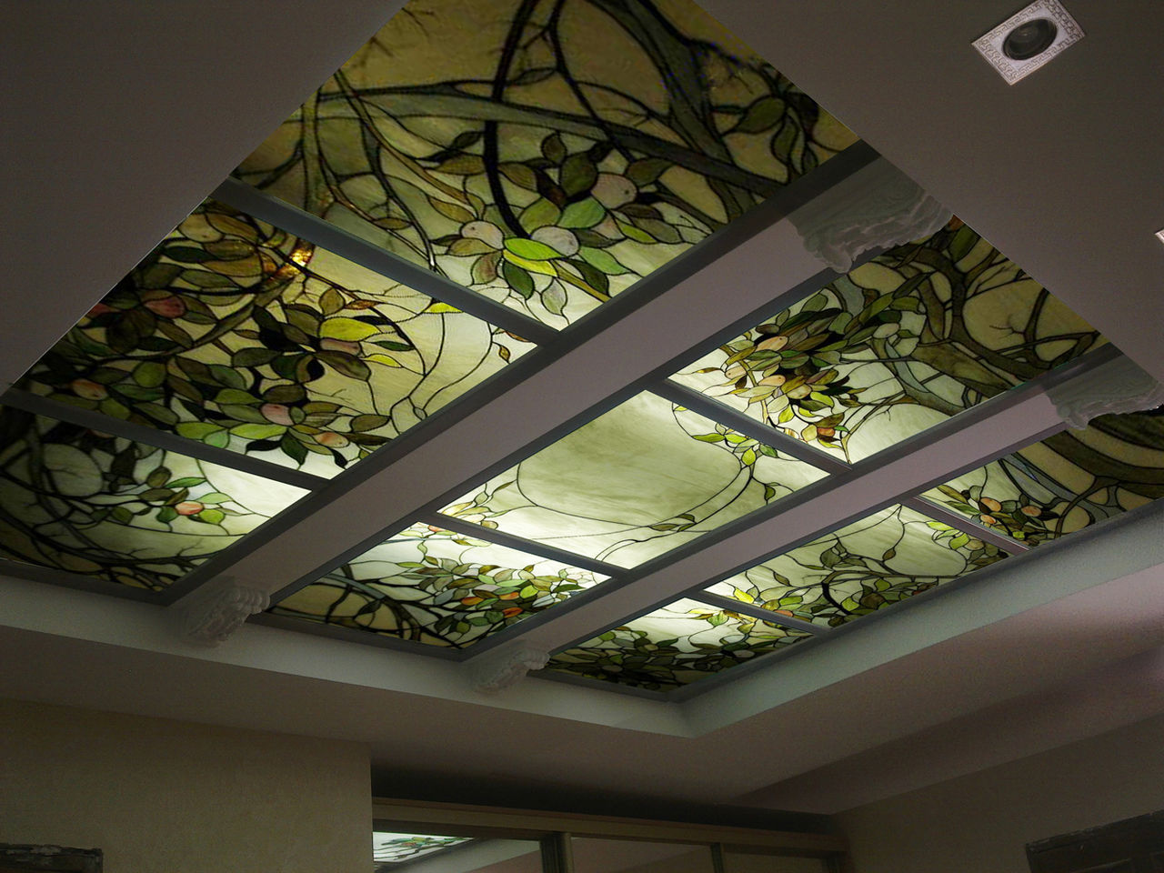 Les vitraux au plafond sont de plus en plus utilisés pour décorer les intérieurs, qui peuvent rendre même les plus petites et les plus sombres visuellement plus grandes, plus légères et plus hautes. Grâce au vitrail au plafond, vous pouvez créer l'illusion d'une verrière, derrière laquelle il y a un espace illimité. Vous pouvez intégrer un vitrail dans une charnière plafond en plaques de plâtre ou en bois, le rétroéclairage devient une exigence obligatoire. Si la zone de la pièce est très petite, vous pouvez utiliser un abat-jour en vitrail.
