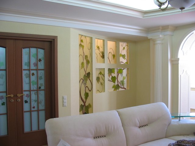 Les vitraux réalisés par la technologie du sablage sont universels et peuvent devenir une décoration absolument n'importe quel intérieur. Le motif sur le verre est créé en le traitant avec un puissant jet d'air-abrasif à l'aide d'un pochoir; le sable est utilisé comme abrasif. Par conséquent, vous pouvez obtenir un motif mat sur une surface brillante ou vice versa. En utilisant la technologie de sablage, il est possible d'appliquer n'importe quel motif, motif ou même photographie au verre, et vous pouvez même créer des dessins 3D en utilisant différentes profondeurs de traitement dans différentes zones. Éclairage en relief vous permet de créer l'effet d'une image en trois dimensions.