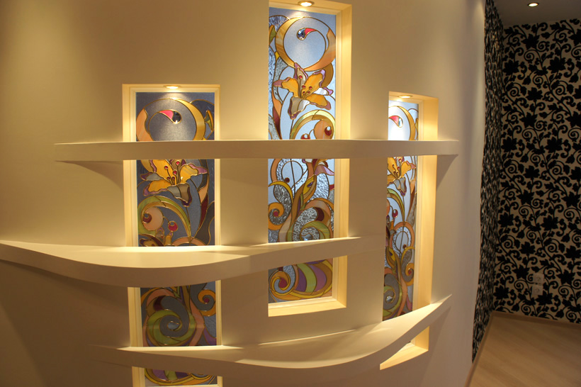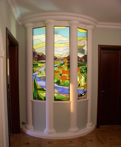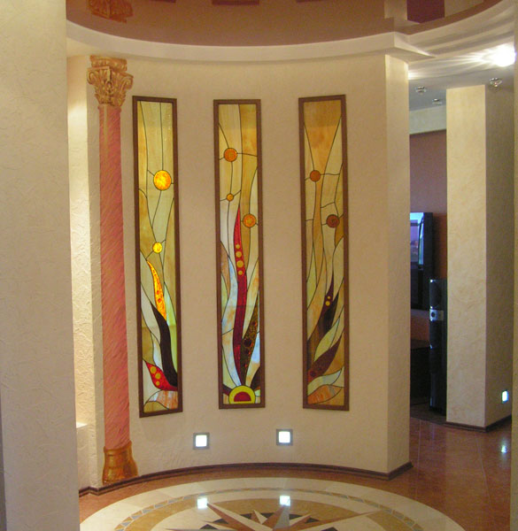 Des panneaux en verre teinté peuvent être utilisés pour décorer les murs.Si en même temps organiser l'éclairage, un tel vitrail peut servir de veilleuse intéressante, jouer le rôle d'éclairage décoratif ou devenir un détail d'accent à l'intérieur de n'importe quelle pièce. Si vous considérez qu'avec l'aide de différentes techniques, vous pouvez appliquer presque n'importe quel motif, nous obtenons la plus grande latitude pour l'imagination du design. De même, vous pouvez créer fausses fenêtres, et c'est une solution indispensable pour les pièces dans lesquelles la lumière naturelle ne pénètre pas.
