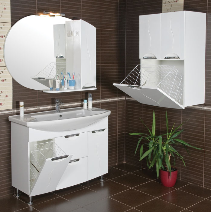 - armoires standard ou classiques - l'option la plus courante. Ce sont des armoires verticales d'une hauteur d'au moins 80 cm, qui sont souvent installées au-dessus lavabopendre moins souvent bain. Les dimensions peuvent varier considérablement, ainsi que l'organisation interne de l'espace, les portes, en règle générale, sont rames. Lorsque vous regardez un tel placard pour votre petite salle de bain, assurez-vous que lorsqu'il est ouvert, il ne dérangera personne ni rien. Si vous prévoyez d'installer une armoire au-dessus du lavabo, il vaut mieux largeur correspondait aux dimensions du lavabo lui-même ou du meuble sur lequel il était installé. Si possible, il est préférable d'acheter un meuble articulé avec un meuble vasque afin d'obtenir un intérieur harmonieux.