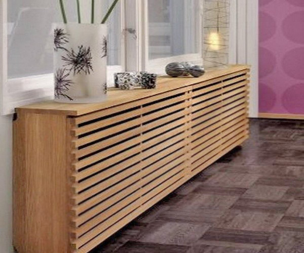 Pour masquer les batteries, vous pouvez également utiliser des écrans en bois, qui sont à la fois attachés et plats, si le radiateur est situé dans niche. Cette option peut être appelée la plus vert et l'un des plus attrayant en apparence, car vous pouvez obtenir des écrans avec les motifs les plus bizarres d'un arbre malléable pour le traitement. Extérieurement, un tel écran peut avoir tout type d'apparence, il peut être acheté à la fois prêt à l'emploi et sur mesure.