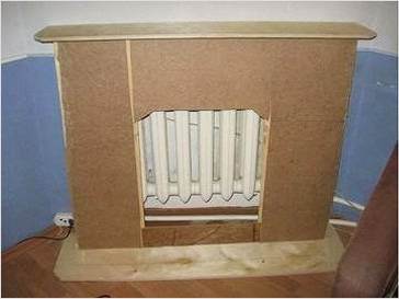 - la création de fausse cheminée au-dessus du radiateur de chauffage. Le cadre du foyer peut être en cloison sèche ou en contreplaqué, le trou est fermé avec une grille métallique. Avec la bonne finition, le design ressemblera autant que possible à une vraie cheminée, et en hiver, la chaleur réelle ira de là.