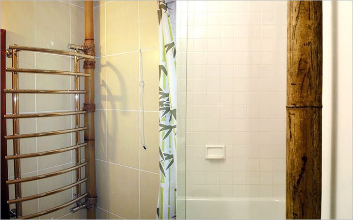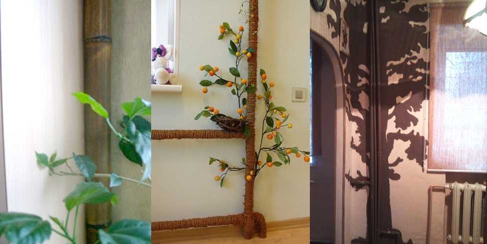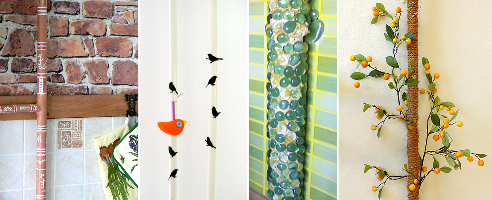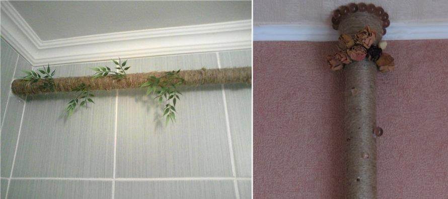 Une alternative à la peinture des tuyaux est décoration. Ils peuvent être enveloppés de corde de jute ou de chanvre, décorés de feuilles ou de fleurs artificielles. Des tuyaux horizontaux très bien situés se cachent sous rideauxet bas - sous plinthes.