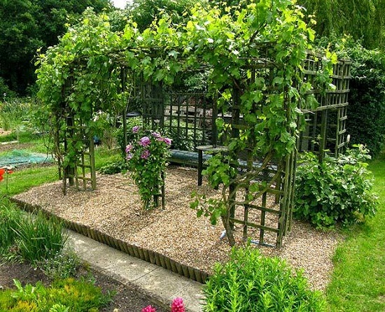 Inconvénients plus: tout d’abord, c’est un soin constant, consistant à arrosage, la fertilisation et l'élagage, et d'autre part, pas la pluie la plus lourde ne sera déjà un obstacle au déjeuner en plein air. Un gazebo "live" est une option pour ceux qui passent beaucoup de temps dans le pays et sont prêts à attendre que la structure "grandisse". Excellente alternative - utilisez des plantes grimpantes (raisin, vigne, lierre), qui entrelaceront une charpente métallique.