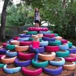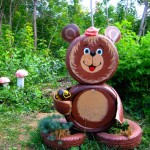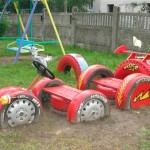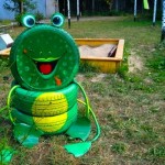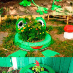 Les pneus conviennent à la conception de terrains de jeux. En empilant des pneus d'une certaine taille les uns sur les autres et en les peignant dans les couleurs nécessaires, vous pouvez décorer le site avec de jolies grenouilles, ours, escargots, lièvres, bonhommes de neige, poupées gigognesEt si vous utilisez des bouteilles en plastique, vous pouvez créer les bêtes les plus bizarres.
