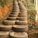 Dans les chalets d'été situés sur un terrain vallonné, où les montées et les descentes sont inévitables, un escalier peut être aménagé à partir de vieux pneus - vous n'aurez même pas à les couper, mais vous en aurez besoin de beaucoup.Ils commencent à écarter les pneus par le bas, le premier est monté là où la marche devrait être, la base doit d'abord être coupée. Vous pouvez noyer un peu les pneus dans le sol pour rendre l'échelle plus stable. Couvrir immédiatement le pneu avec de la terre, puis couper la zone pour l'étape suivante, mettre le deuxième pneu, etc. Il vaut mieux que les pneus se chevauchent - il sera plus pratique et plus sûr de monter et descendre.