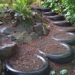 Allées de jardin de pneus inutiles peuvent se vanter de qualités uniques comme absolument surface antidérapante, facilité de nettoyage et résistance aux influences négatives, sans oublier la disponibilité du matériel. Pour les chemins étroits, les pneus des voitures conviennent, pour les pistes plus larges, il est préférable d'utiliser les pneus des camions.