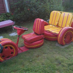 - confortable fauteuil peut être construit si vous fixez deux pneus l'un sur l'autre et que vous y attachez un dos à partir du troisième pneu avec des vis. Des protections séparées, vous pouvez même faire une balustrade et utiliser des oreillers moelleux comme siège;