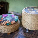 - deux pneus empilés les uns sur les autres, peints dans une teinte agréable et recouverts d'un siège doux - c'est déjà pratique pouf country. Complet avec lui, vous pouvez utiliser une table composée de plusieurs pneus de diamètre légèrement plus petit, et une feuille de contreplaqué ou de verre trempé convient comme plateau de table;