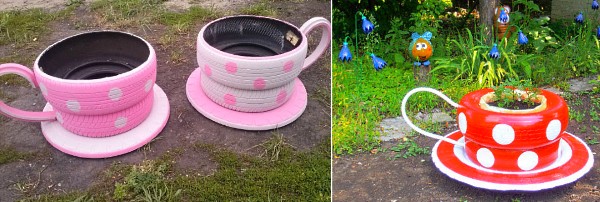 À l'aide d'une habile coloration des pneus, un parterre de fleurs peut être transformé en un véritable chef-d'œuvre et stylisé comme une grande tasse, une princesse grenouille ou des personnages de dessins animés, peints avec Gjel ou Khokhloma.