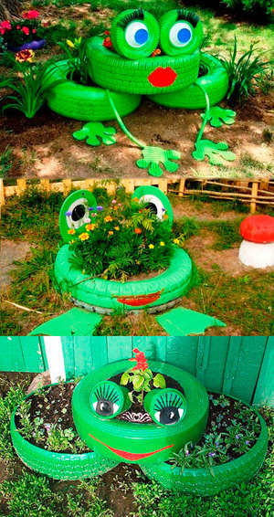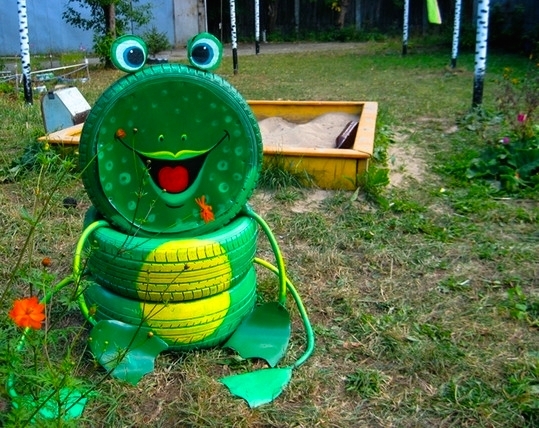 Les pneus conviennent à la conception de terrains de jeux. En empilant des pneus d'une certaine taille les uns sur les autres et en les peignant dans les couleurs nécessaires, vous pouvez décorer le site avec de jolies grenouilles, ours, escargots, lièvres, bonhommes de neige, poupées gigognesEt si vous utilisez des bouteilles en plastique, vous pouvez créer les bêtes les plus bizarres.