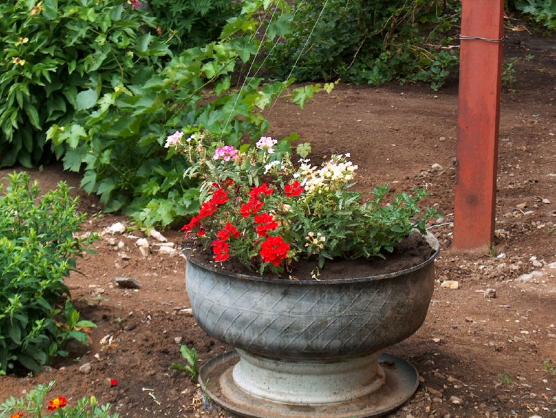 - l'option la plus simple - il suffit de mettre le pneu à l'endroit où le parterre sera organisé, de le remplir de terre et de procéder à la plantation des fleurs. Pour donner au parterre un aspect attrayant, le pneu est pré-peint dans la teinte nécessaire, les motifs appliqués, etc.;
