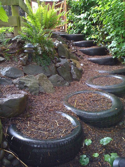 Allées de jardin de pneus inutiles peuvent se vanter de qualités uniques comme absolument surface antidérapante, facilité de nettoyage et résistance aux influences négatives, sans oublier la disponibilité du matériel. Pour les chemins étroits, les pneus des voitures conviennent, pour les pistes plus larges, il est préférable d'utiliser les pneus des camions.