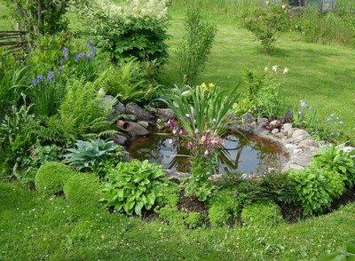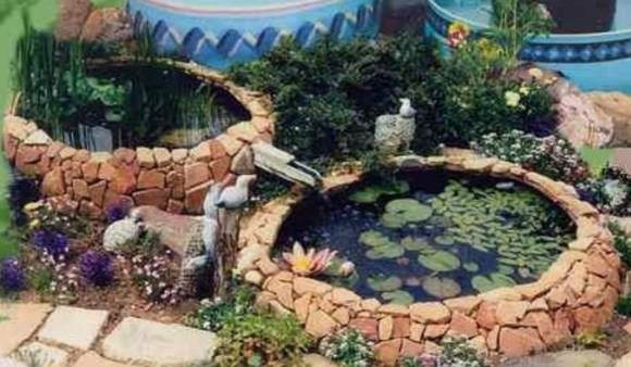 De plus, vous pouvez organiser un réservoir intéressant si vous placez deux pneus côte à côte, et vous pouvez connecter deux étangs avec un pont décoratif. Si les plans d'eau voisins sont à différents niveaux (l'un à la surface de la terre, l'autre est enterré), vous pouvez créer un étang avec débordement. Si vous avez le désir et les compétences, vous pouvez même organiser une petite cascade.