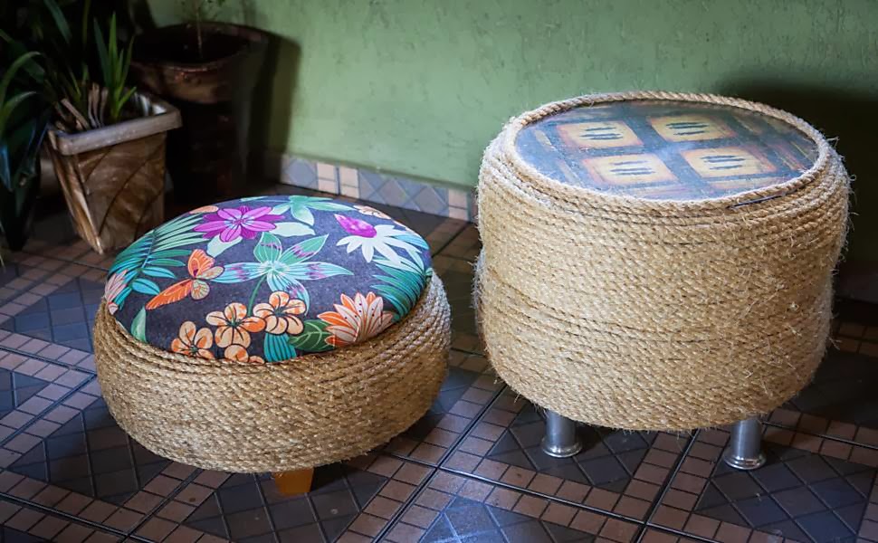 - deux pneus empilés les uns sur les autres, peints dans une teinte agréable et recouverts d'un siège doux - c'est déjà pratique pouf country. Complet avec lui, vous pouvez utiliser une table composée de plusieurs pneus de diamètre légèrement plus petit, et une feuille de contreplaqué ou de verre trempé convient comme plateau de table;