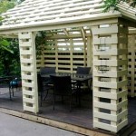 Vous pouvez fermer tous les murs du gazebo avec des palettes, ou vous ne pouvez les faire que jusqu'à une certaine hauteur - dans tous les cas, l'espace à l'intérieur sera rempli de lumière et bien ventilé. Gazebo sur le toit mieux fait de polycarbonate, parmi les alternatives - tuile flexible, onduline et tuile en métal.